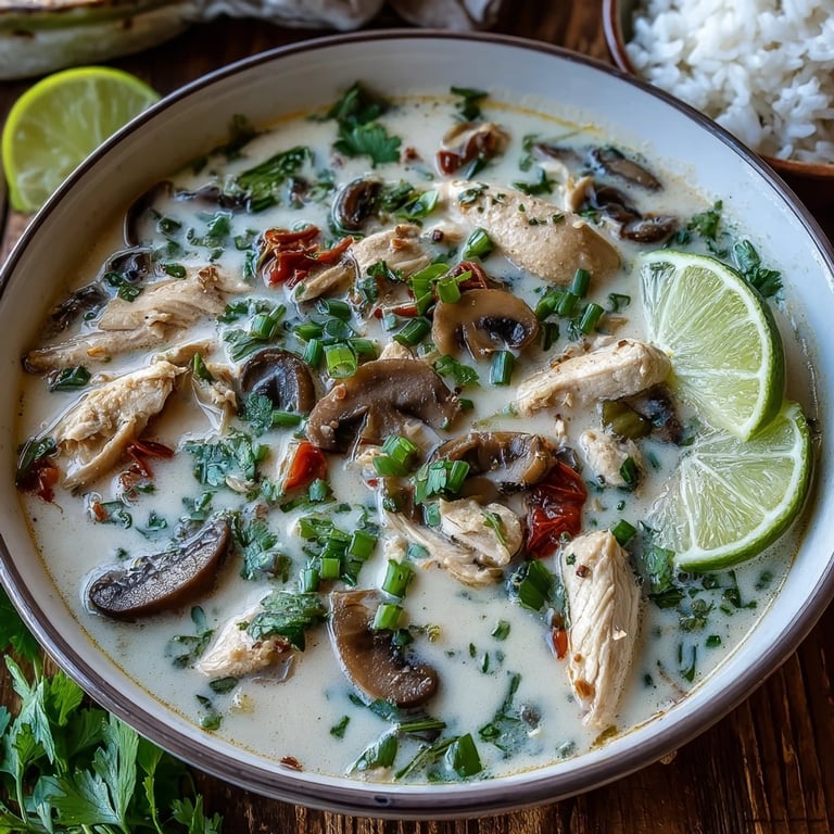 Save The scent of lemongrass and lime fills my kitchen whenever I make Tom Kha Gai, transporting me to that tiny street food stall in Bangkok where I first tasted it. Through the steam rising from the pot, I can almost see the elderly woman who showed me how to bruise the lemongrass properly, laughing at my clumsy attempts. Years later, this soup has become my remedy for everything from winter colds to homesickness, with its perfect balance of sour, salty, and creamy flavors.