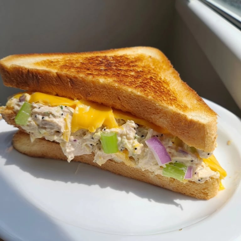 Save A golden, crispy sandwich filled with creamy tuna salad and gooey melted cheese — the perfect quick and satisfying snack.