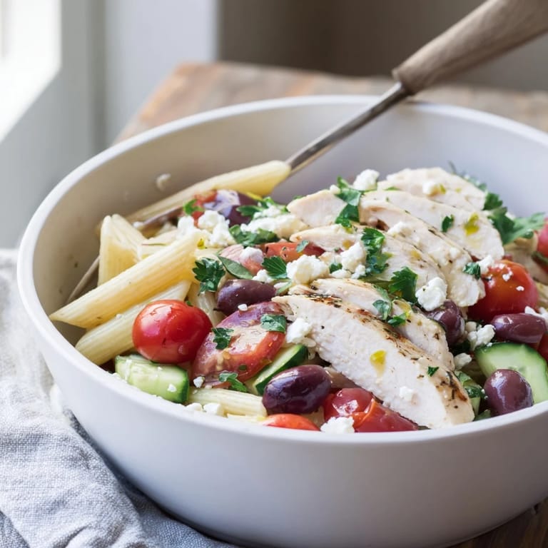 Save Last summer, my neighbor Maria returned from her annual trip to Crete carrying nothing but jars of olive oil and stories about village meals. She dragged me into her kitchen, sun still streaming through the window, and assembled this bowl with the kind of casual confidence that comes from making something a thousand times. The way the lemon hit the warm chicken filled the entire house, and I knew immediately that this wasn't just dinner, it was a vacation disguised as pasta.