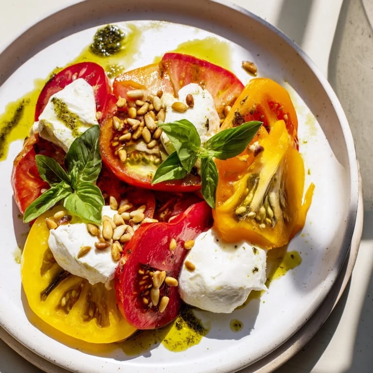 The magic here is temperature contrast—cool tomatoes and cold burrata against the brightness of fresh basil oil. If you make everything ahead, the basil oil will darken and lose some of its glow, so blend it while your guests are arriving and the tomatoes are already arranged. The whole thing takes less time than it takes someone to open a bottle of wine, which is exactly the point.