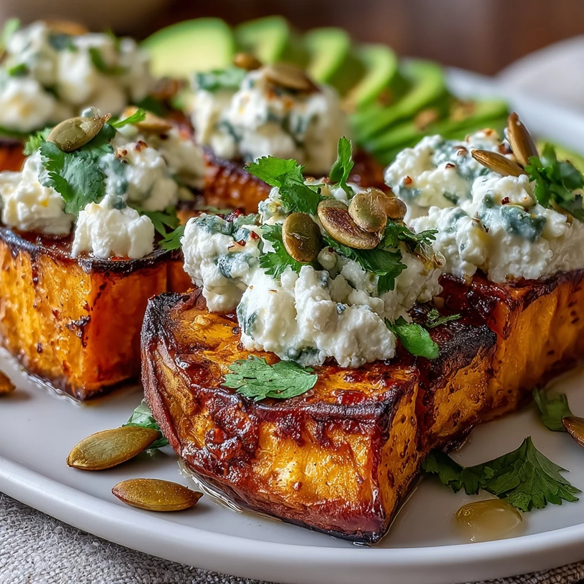 - Divide the roasted sweet potatoes between two bowls, then add avocado slices and a generous scoop of cottage cheese to each one. Drizzle generously with hot honey, sprinkle your garnishes on top, and serve immediately while the sweet potatoes are still warm.