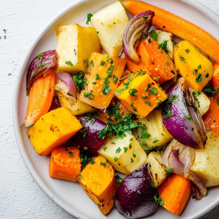 Save Experience the comforting warmth and vibrant flavors of a Roasted Root Vegetable Medley with Balsamic Glaze. This dish combines a colorful mix of tender oven-roasted root vegetables, their natural sweetness enhanced by a tangy and glossy balsamic glaze. Ideal as a hearty side or a fulfilling vegetarian main, it brings both nutrition and visual appeal to any meal.
