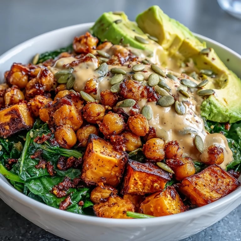- Divide the roasted sweet potatoes, crispy chickpeas, and garlicky spinach among four bowls, then drizzle generously with that smoky dressing. Top with avocado slices, toasted pumpkin seeds, and fresh cilantro or parsley if you have them—these toppings add texture and freshness that make the bowl feel complete.