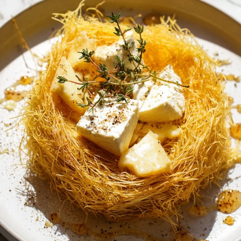 Shredded phyllo dough, also known as kataifi, is used to create the crisp nests that hold the cheese.