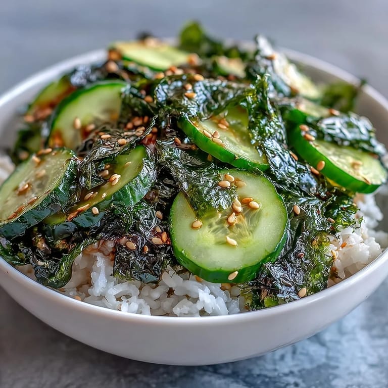 Save There's a moment, right before the first bite, when I look at this bowl and notice how the different greens catch the light—the deep forest of nori, the pale translucence of cucumber, the bright seaweed—and it reminds me why simple food, made with intention, stays with you longer than anything complicated ever could.